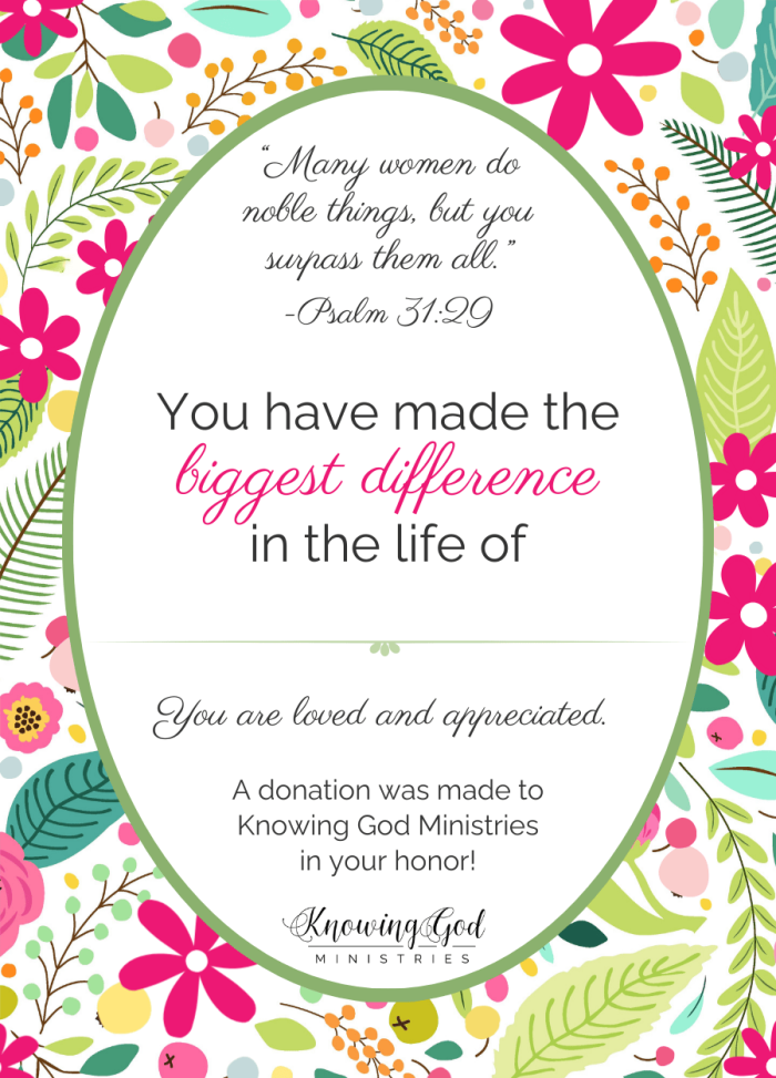 Knowing God Ministries is a 501(c)3 tax deductible organization. Your donation is tax deductible. Though we are growing, your gift in a ministry our size goes a long way! Thank you for considering the opportunity to join God in His work in KGM.