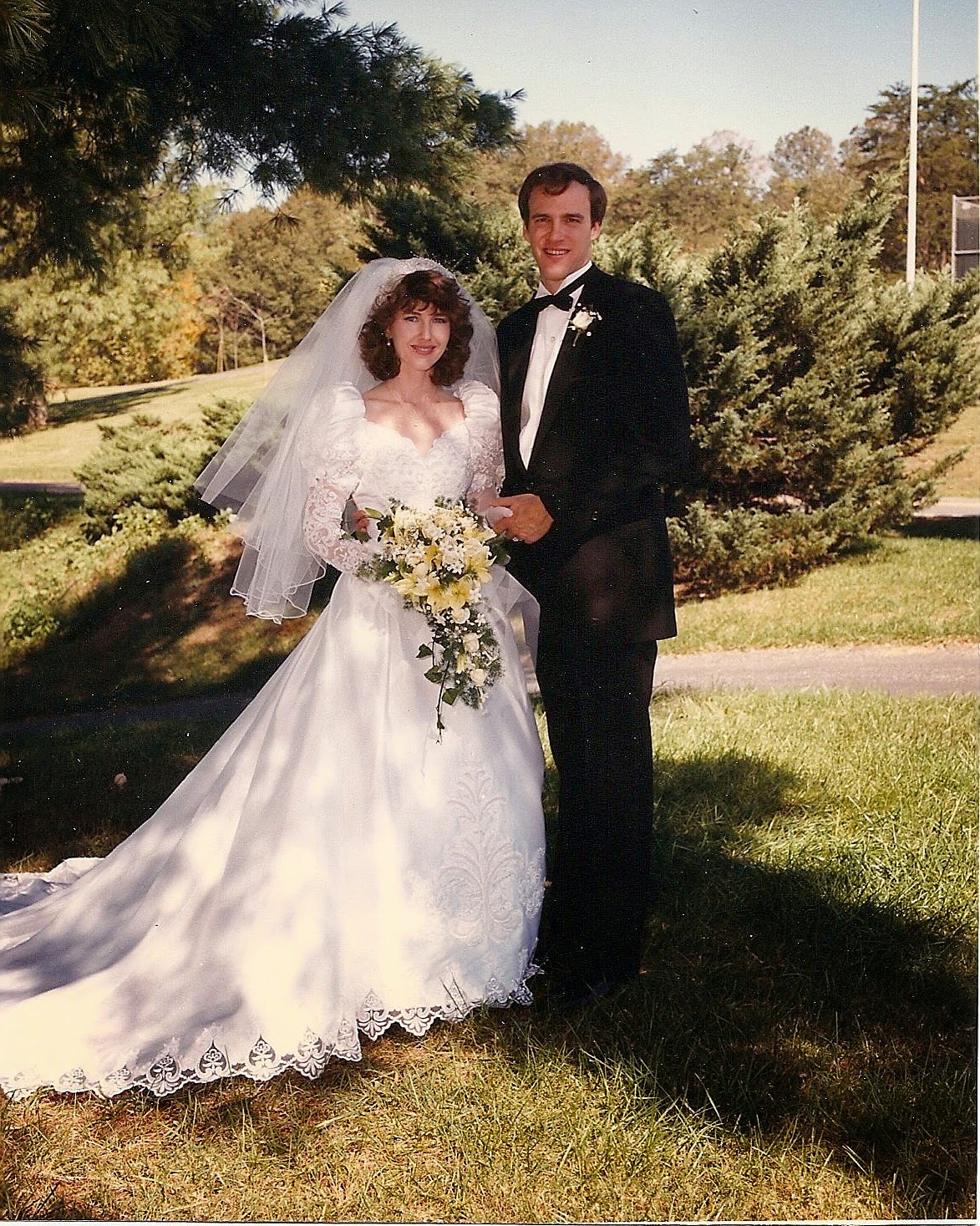 Most southern brides in the eighties had their portraits made in their beautiful gowns and I of course wanted to do the same. On a humid, hot August day my roommate came to help me assemble my dress and veil and keep me organized! My photographer, gifted in the skill of helping brides to pose took multiple shots —all elegant and classy.
